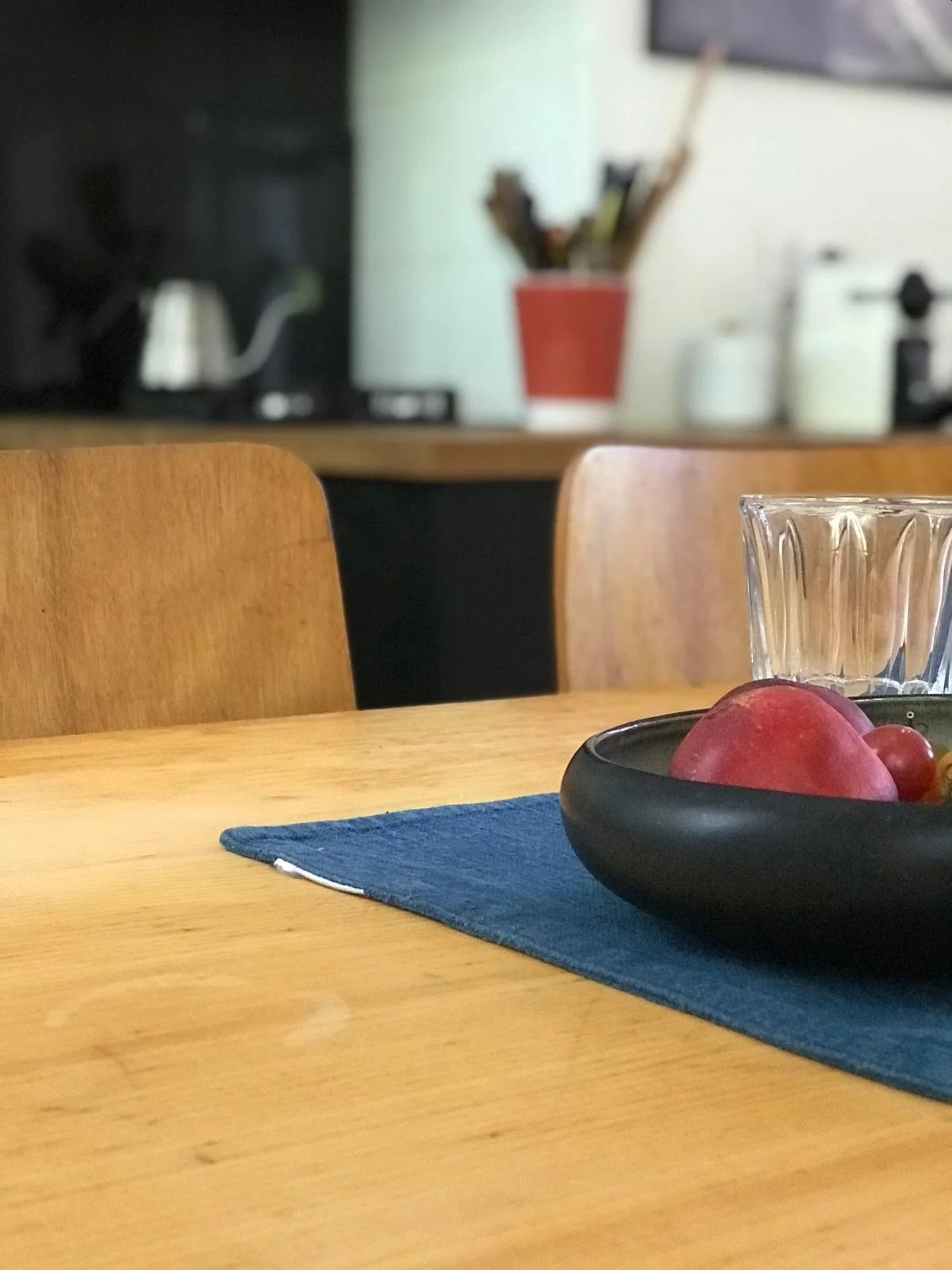 La cuisine est ouverte vers le salon ou les teintes de bois et de noir font écho à la table et à ses chaises.