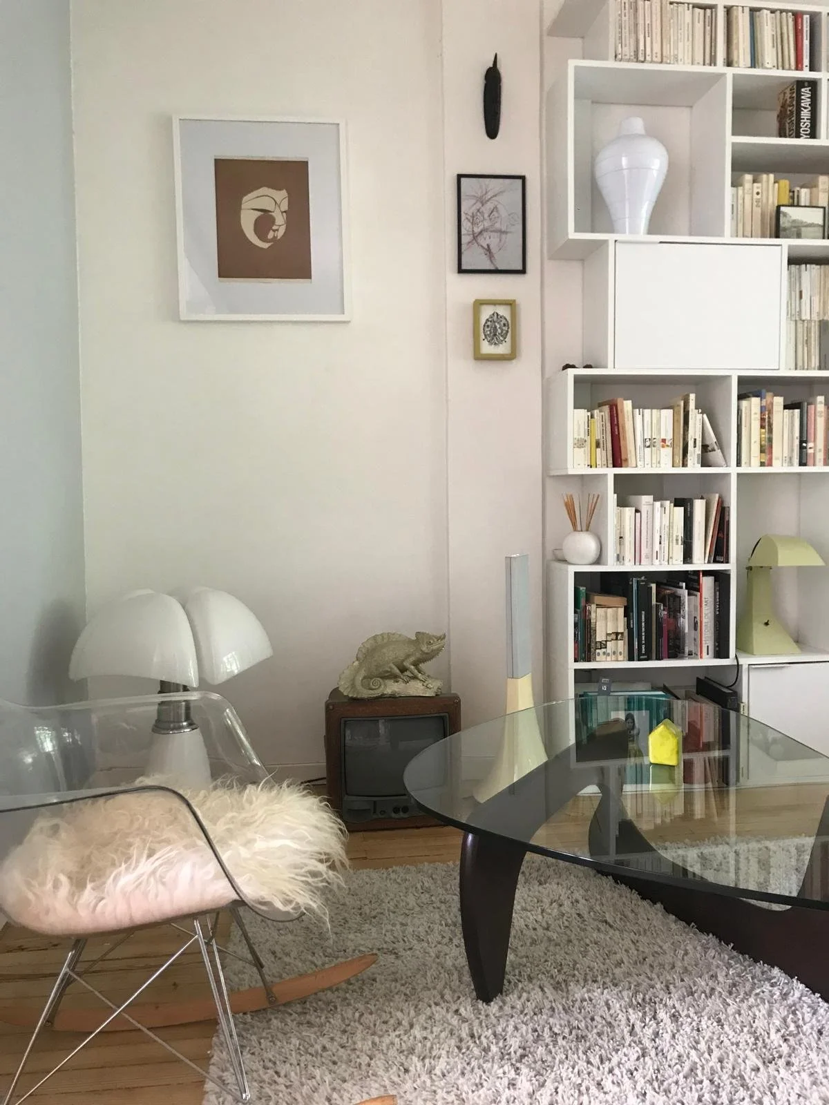 La grande force du projet a été la recherche de la lumière traversante, d’une fenêtre à l’autre. À peine rentré dans l’appartement, ce souhait est mis en avant grâce à l’ouverture des espaces entrée, salon, salle à manger et cuisine. L’entrée se structure avec de nombreux rangements alors que la bibliothèque du salon, réalisée sur mesure, sert autant à accueillir des livres que des objets racontant une histoire de la vie des propriétaires.