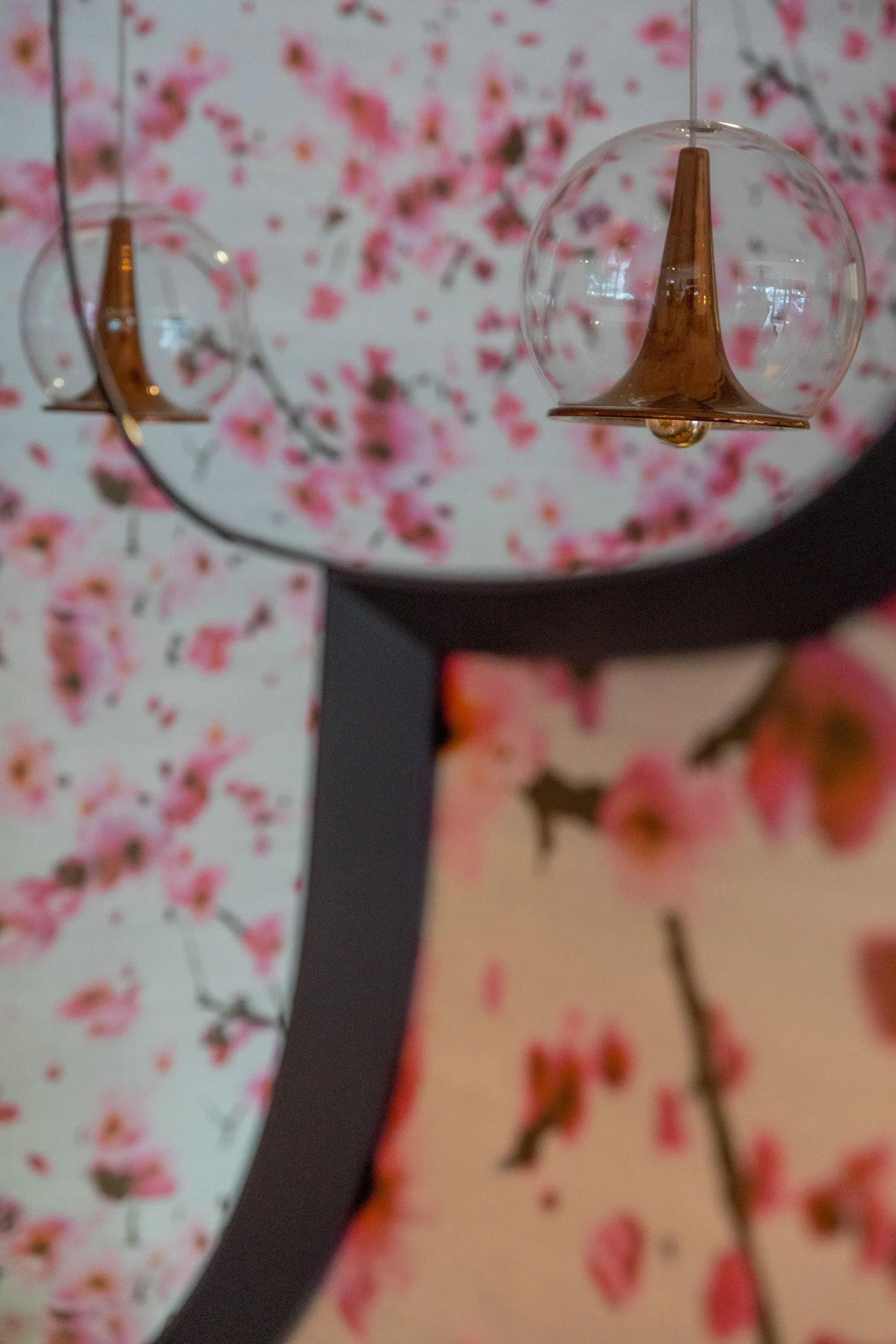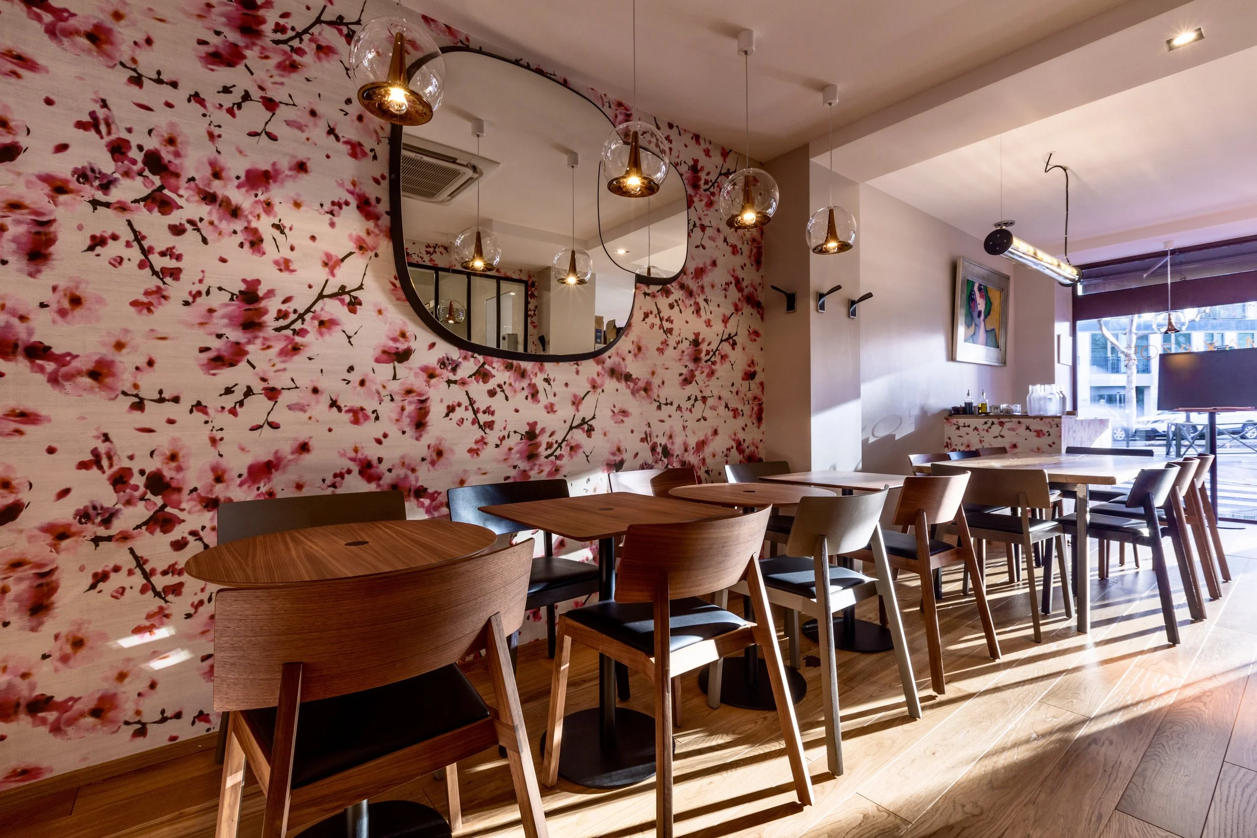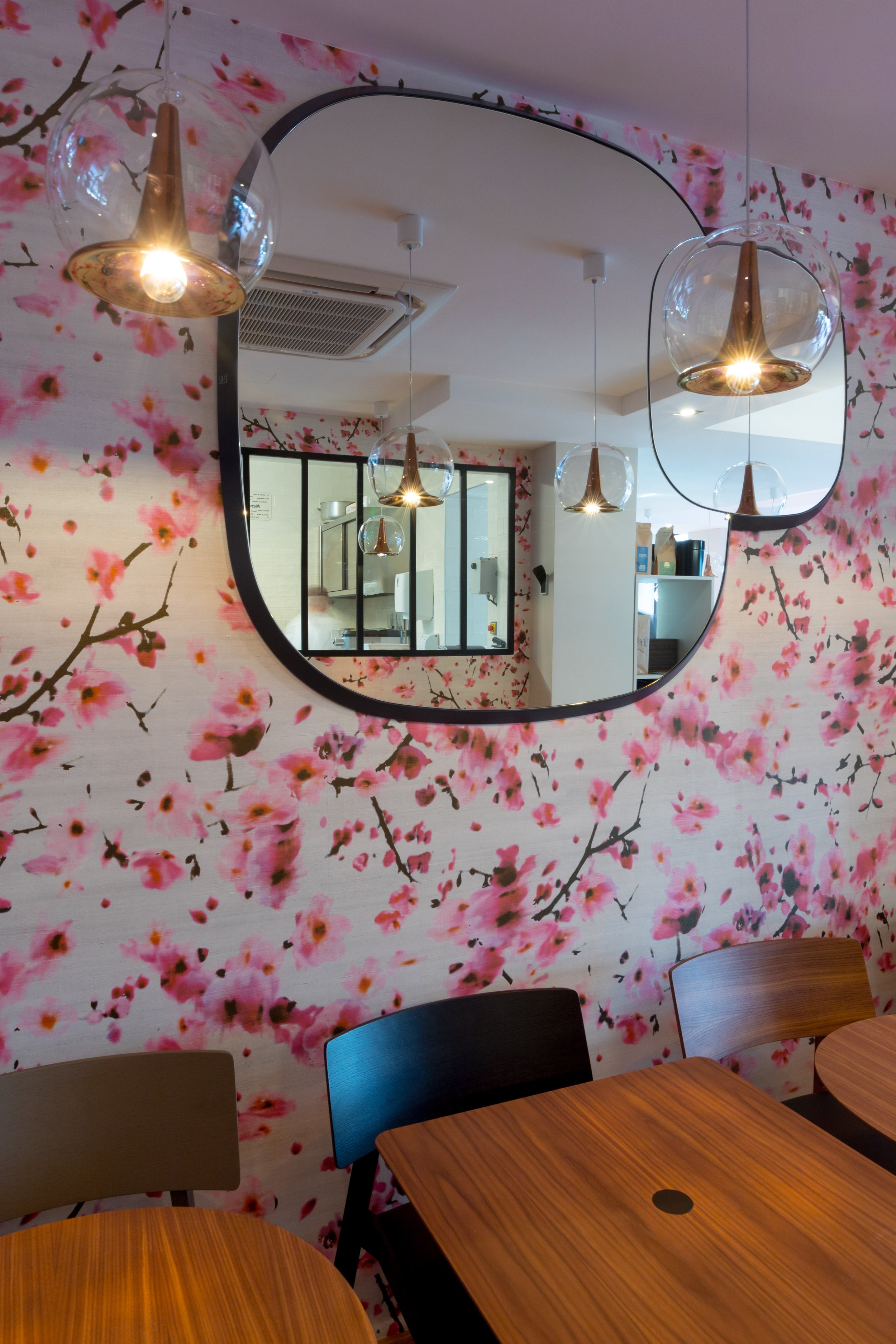 Le papier peint aux inspirations japonaises reprend les codes de la cuisine subtile de ce restaurant. Le lieu est très lumineux, la décoration a été pensée pour toutes les générations, avec une table d’hôtes éclairée par une lampe DCW de la collection “in the tube”, au design inclassable et intemporel.